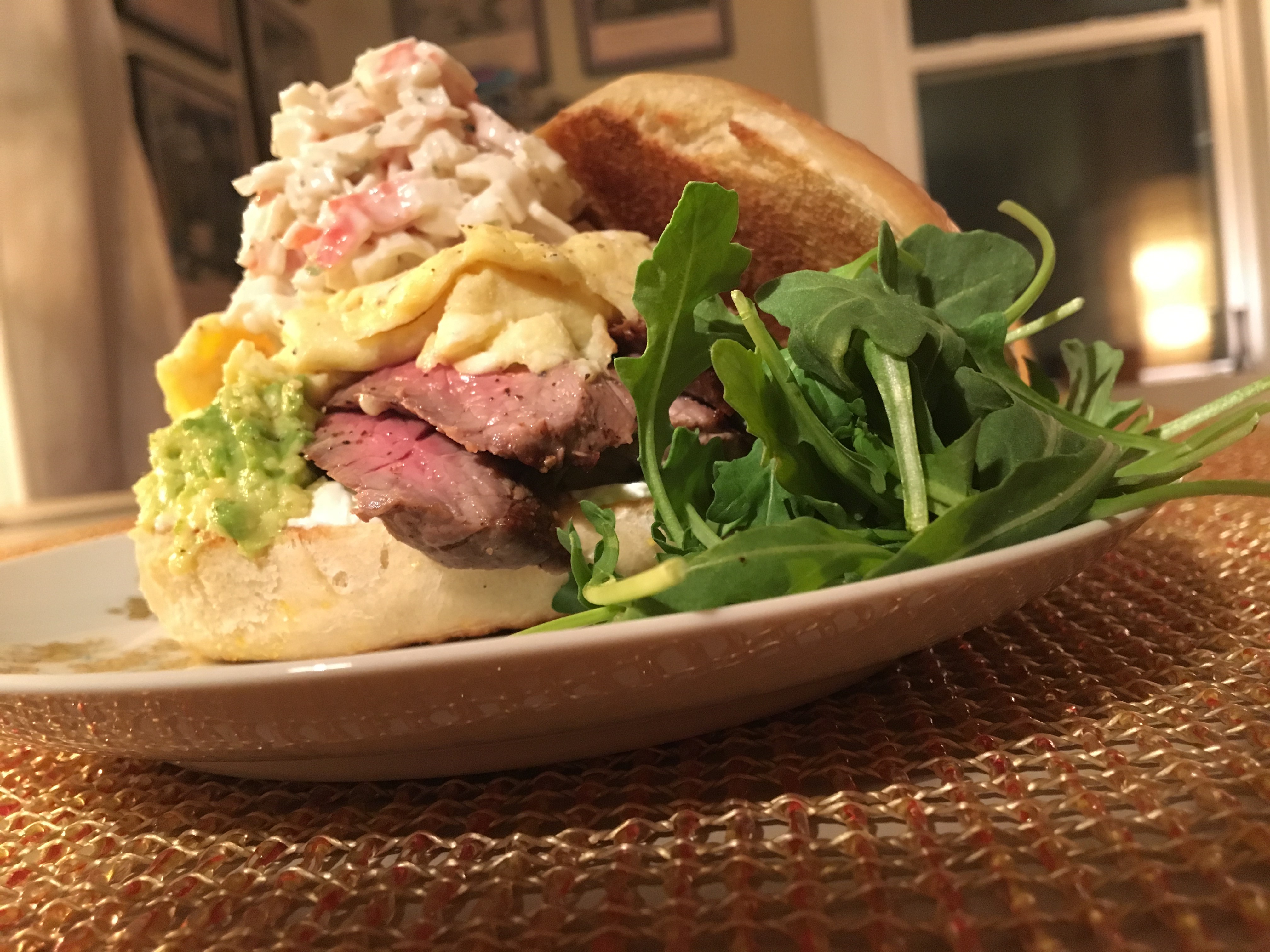 - Assemble sandwich starting with thinly sliced avocado, followed by arugula, egg, sliced steak and topped with crab salad